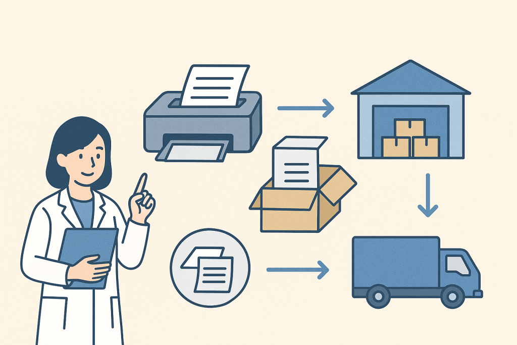 従来の一般的な物流スキームだけでは、こうした要求に対応するのは難しいケースが多く、特に少ロット多頻度、可変印字、添付文書封入、複数納品先などが絡むと、社内リソースや物流設計への負荷が大きくなります。